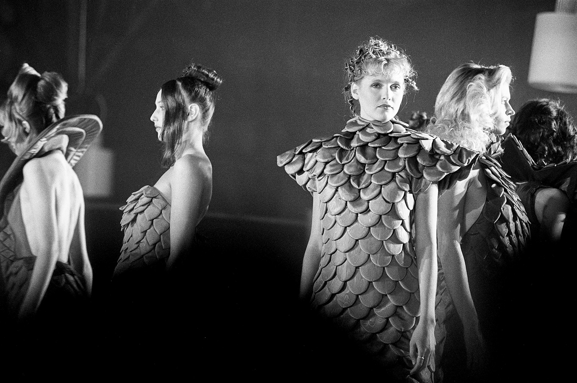 Tērpi no Bruno Birmaņa kolekcijas. Nepieradinātās modes asamblejas atklāšanas performance 1994. gadā. Foto – Aivars Liepiņš