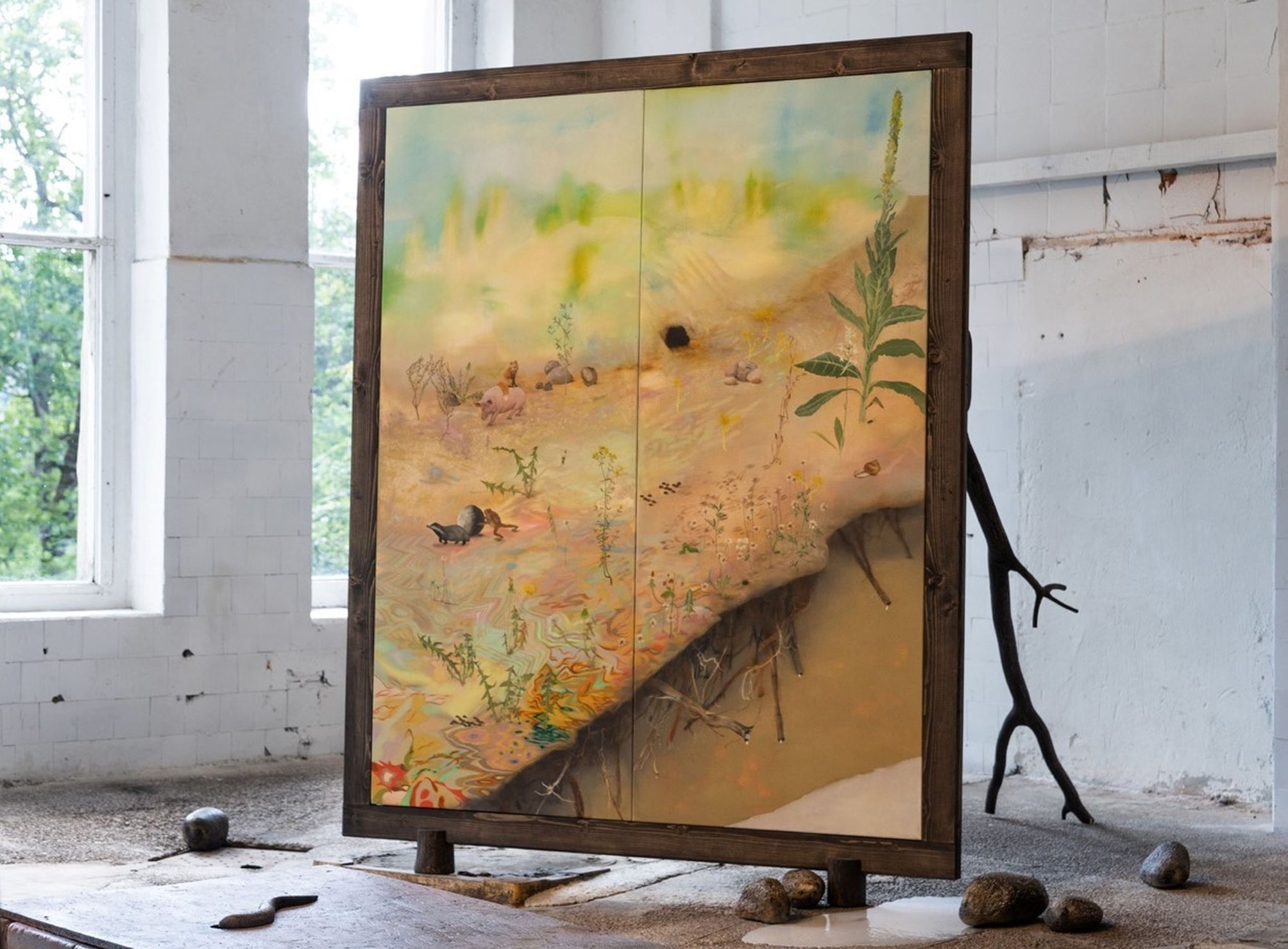 Ieva Putniņa. Gājiens. 2025. Audekls, eļļa, 202 x 180 cm. Instalācija. Granīts, koks, eļļa, silikons