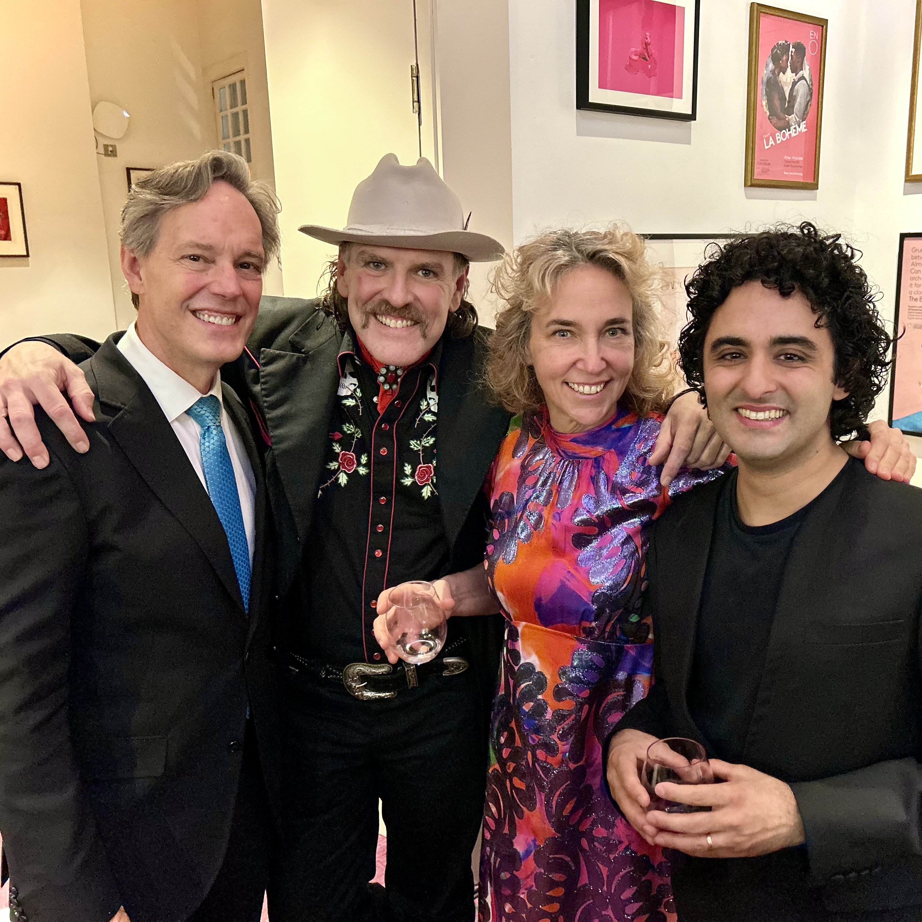 Komponists Džeiks Hegijs (no kreisās), dziedātāji Maikls Meiss un Kristīne Raisa un diriģents Kerems Hasans pēc operas Mirušais nāk jauniestudējuma pirmizrādes Londonā šā gada 1. novembrī. Foto – Jegors Jerohomovičs