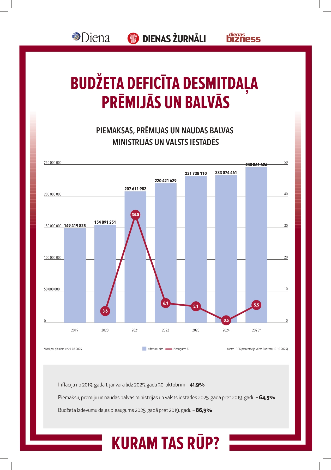 30. septembra raidījums Kas notiek Latvijā? Jāņa Dombura vadībā Latvijas sabiedrības priekšā nolika valsts amatpersonu prēmiju, piemaksu un naudas balvu sadaļu, kas aug ik gadu. Ievērojot, ka 245 miljoni eiro 2025. gadā ir par teju 100 miljoniem vairāk nekā 2019. gadā, tas viegli ierosināja sabiedrisko domu. Proti, ir konkrēts un skaidrs piemērs, kurā redzama pamatīga atlīdzības izaugsme konkrētā sadaļā un periodā.