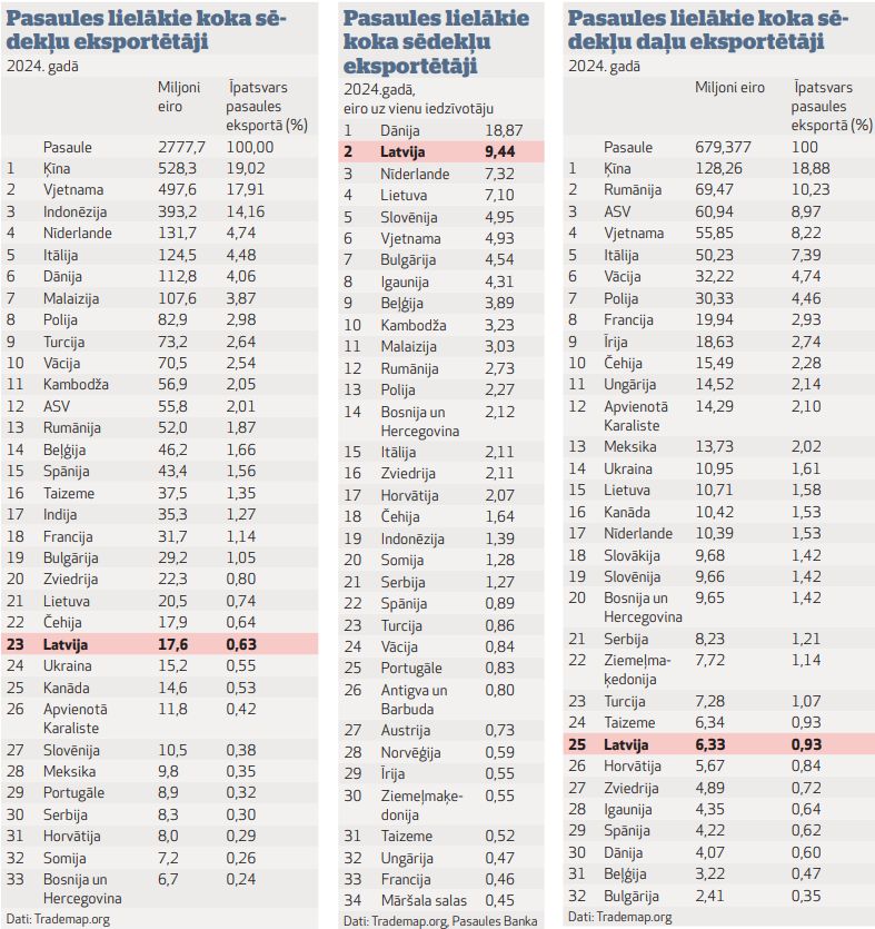 Jāatzīmē, ka 2022. gadā, rēķinot ienākumus no koka sēdekļu daļu eksporta uz vienu iedzīvotāju, Latvija ar 6,33 eiro bija pirmajā vietā pasaulē. Otrajā vietā pasaulē bija Igaunija (4,61 eiro uz vienu iedzīvotāju), bet piektajā vietā – Lietuva (3,6 eiro uz vienu iedzīvotāju).